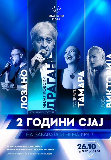 На 26 октомври ќе се случи големиот хуманитарен концерт во атриумот на Diamond Mall, а ќе настапат популарни пејачи Тамара Тодевска, Лозано, Викторија Лоба, кои се познати и по грижата за животните. Специјален гостин ќе биде музичката легенда Драган Мијалковски. Влезот ќе биде бесплатен, а единствен услов, во духот на целиот настан, ќе биде да се донесе минимум еден килограм храна за кучиња, која потоа ќе ѝ биде донирана на „Лајка“, која е партнер на Diamond Mall во реализација на овој хуманитарен настан. Во 14.00 часот ќе бидат објавени добитниците од роденденската наградна игра, по што концертот продолжува.