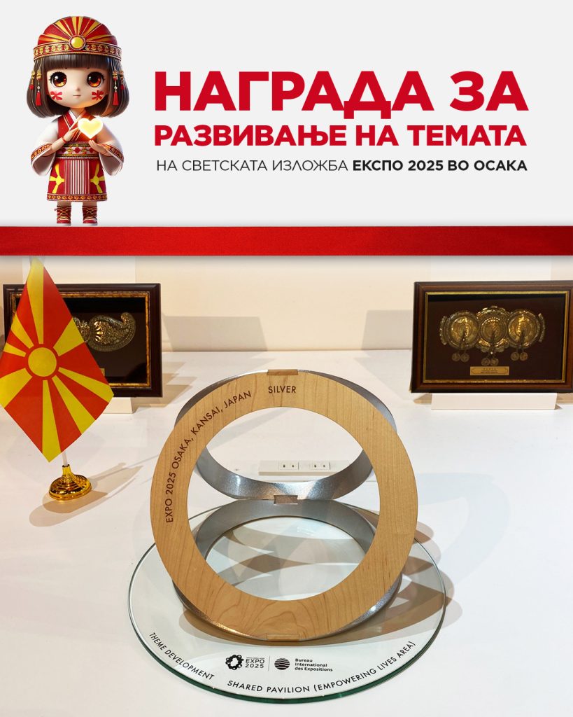 Македонија го освои признанието „Theme Development Award“ (Награда за развивање на темата) на Светската изложба ЕКСПО 2025 во Осака, едно од најзначајните признанија што ги доделува Меѓународното биро за изложби (BIE).