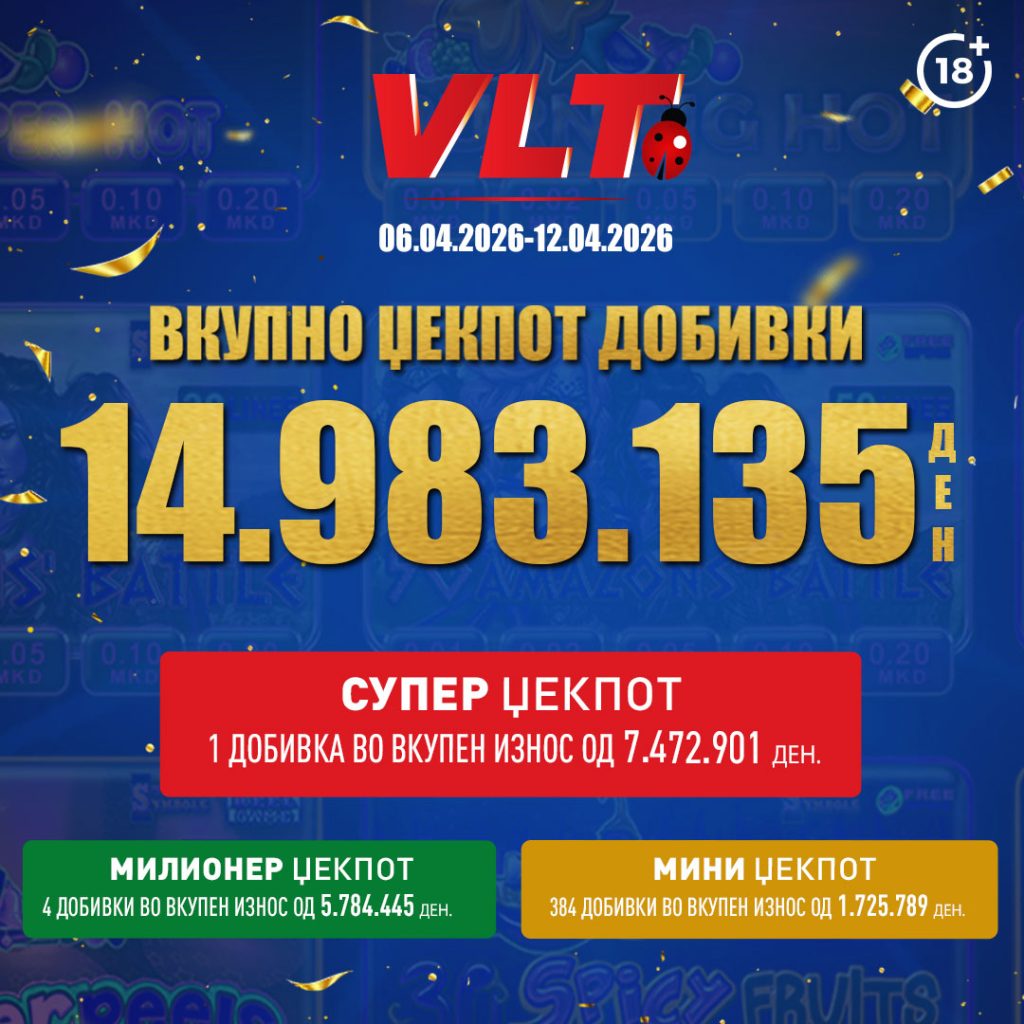 Во периодот од 06.04.2026 до 12.04.2026 година, Видеолотарија Касинос Австрија исплати вкупно 14.983.135 денари кон играчите на ВЛТ терминалите низ Македонија, и тоа: