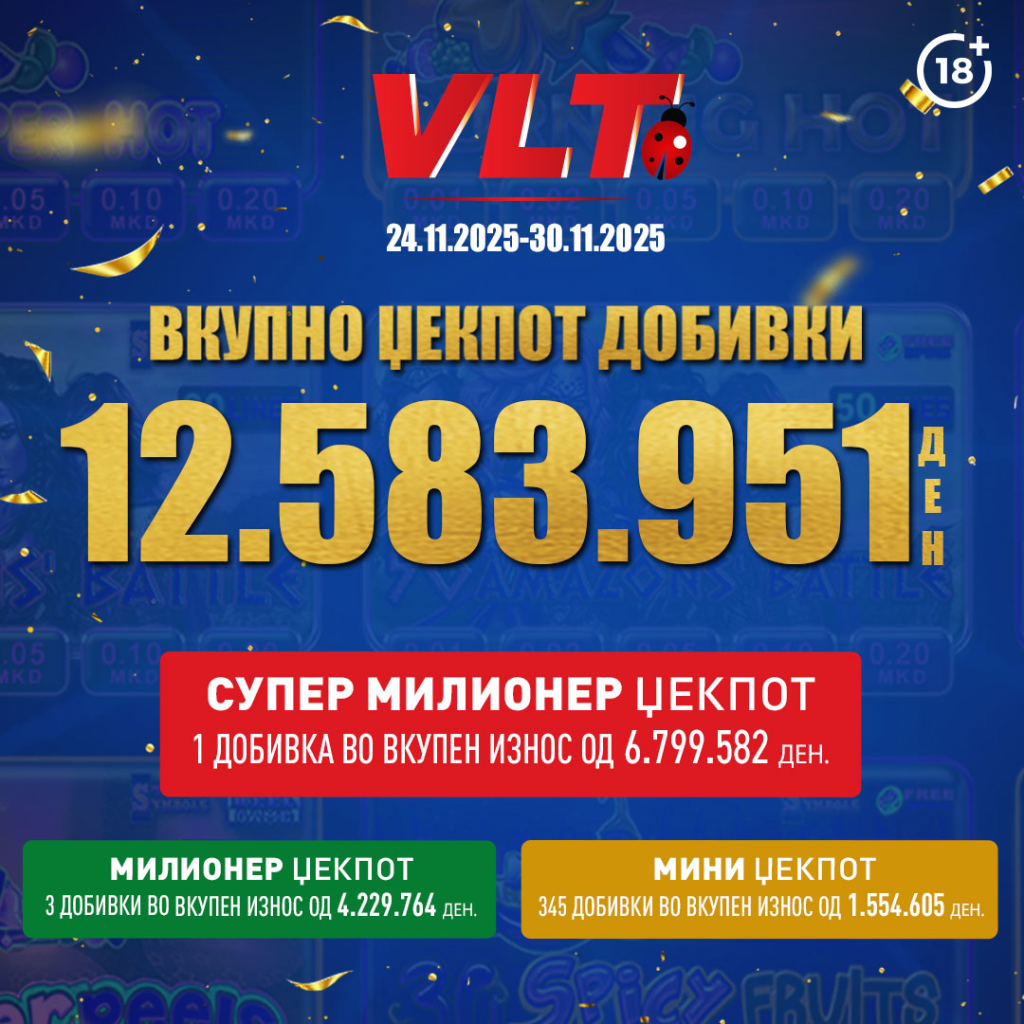 Скопјанецот Ј.М. ја освои најпосакуваната ВЛТ добивка- СУПЕР МИЛИОНЕР ЏЕКПОТ вредна 6.799.582 денари. Неговата среќна игра е 20 Супер хот. СУПЕР МИЛИОНЕР ЏЕКПОТ добивката е освоена на видеолотариските терминали кај нашиот деловен соработник Златна Копачка на 30.11.2025 во Скопје.
