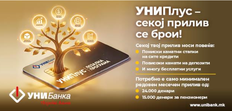 “Овој модел претставува отстапување од вообичаената практика во банкарскиот сектор, каде што програмите за лојалност најчесто се условени со префрлање на плата, што, често претставува бариера за клиентите кои веќе имаат кредитни обврски во друга банка. Свесни за тоа како одлучивме да ги менуваме стандардите и да бидеме како Банка лидер во овозможувањето врвно корисничко искуство. Со УНИПлус им овозможуваме на клиентите поволности, но и поголема слобода во управувањето со нивните финансии“, велат од УНИБанка.