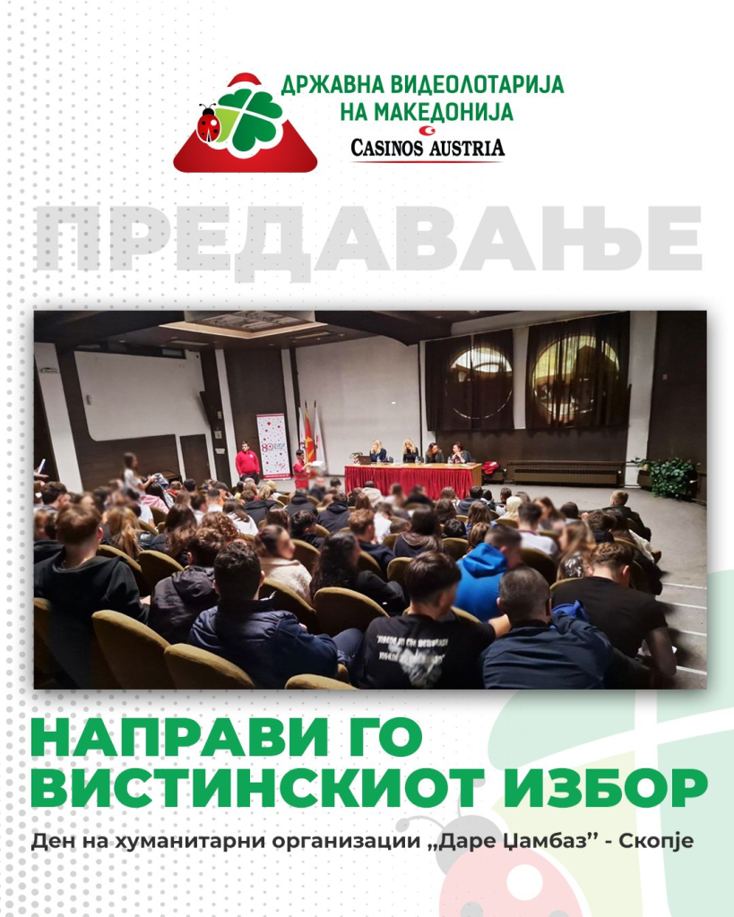Во рамки на проектот „Играј одговорно“, на 11 ноември 2025 година, во Домот на хуманитарни организации „Даре Џамбаз“ во Скопје, се одржа едукативнo предавање, со цел подигнување на свесноста кај младите за ризиците и опасностите од прекумерно играње игри на среќа.