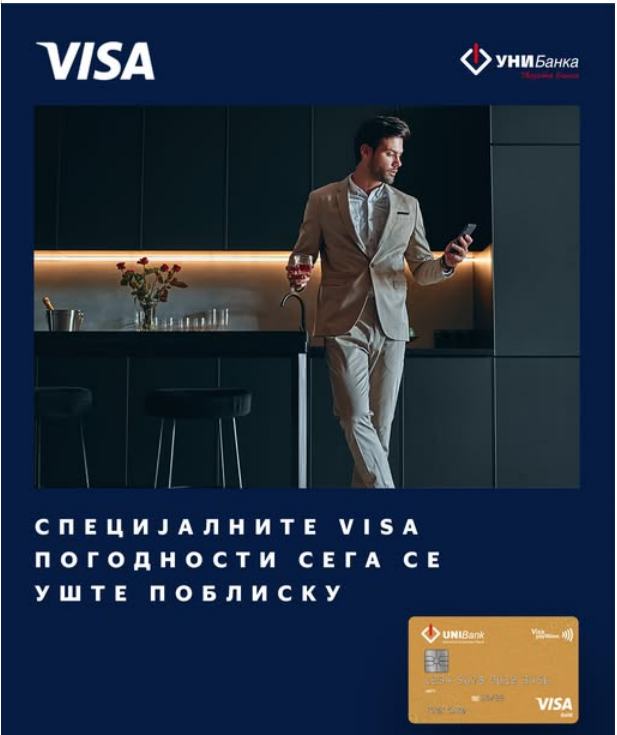 Секој од нас барем еднаш во животот посакал да се почувствува привилегирано, да биде посебен, важен, награден и да ужива бројни придобивки. Сето тоа станува возможно со изборот на Visa Gold кредитната картичка од УНИБанка, картичка која навистина го подигнува вашето искуство на повисоко ниво. Материјалните добра не можат да ја купат среќата, но, сепак во одредени моменти, радоста и насмевката кои тие ја носат е непроценлива.