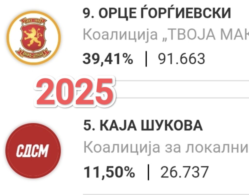 Орце Ѓорѓиевски во прв круг 2025 освојува 91.663 гласови.