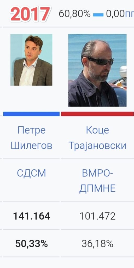 Па така, во 2017 година излезноста во Скопје е 60% од запишаните избирачи. Шилегов освои 141.164 гласови во првиот круг, затворајќи ги изборите со над 50% излезност.