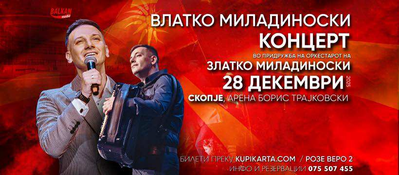 Концертот во арената „Борис Трајковски“ ќе биде исполнет со најголемите хитови од неговиот репертоар, но и со нови музички изненадувања. Во придружба на големиот оркестар на Златко Миладиноски, оваа вечер ќе биде вистинска музичка магија, каде звукот на тапаните, кавалите и гласот на Влатко ќе се спојат во моќна симфонија што ќе ја разбуди секоја емоција кај публиката. Влатко Миладиноски не е само пејач, тој е гласот на едно време, симбол на постојаност и пример дека уметноста не се создава за трендови, туку за вечност. На 28 декември, под светлата на арената, ќе се роди уште една страница во историјата на македонската музика, страница што гордо ќе го носи името Влатко Миладиноски.