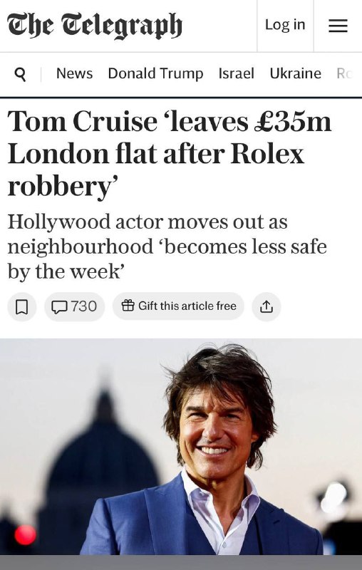 Том Круз го напушта својот стан во Лондон вреден 35 милиони фунти по грабежот во продавницата „Ролекс“.