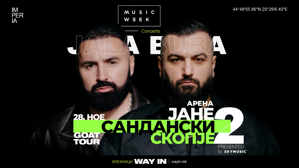 Со години на врвот на балканската сцена, со безброј хитови и милионски прегледи, Jala и Buba спектакуларно, со два СКОПСКИ концерти ја стартуваат големата GOAT TOUR во чии рамки ќе посетат повеќе од 10 европски метрополи. Турнејата потпишана од Music week плaтформата стартува од Скопје по што ќе следуваат настапите во Штутгарт, Загреб и други градови.