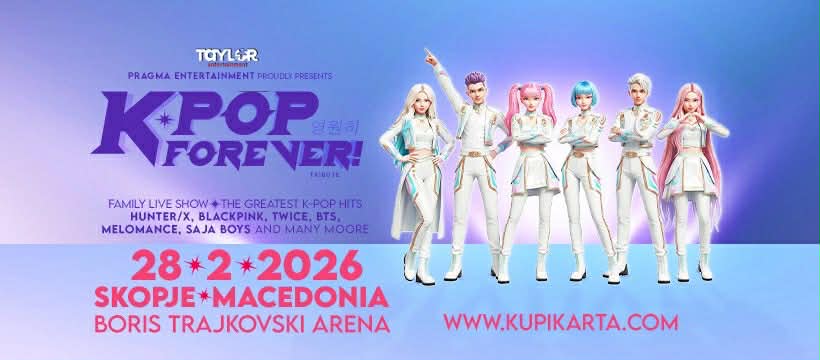 Во Скопје пристигнува мултимедијалниот спектакл K-POP FOREVER – шоу што ја слави најголемата музичко културна револуција на 21. век. Македонската публика ќе има ексклузивна можност да го доживее овој глобален феномен на 28 февруари 2026 во арената „Борис Трајковски“.