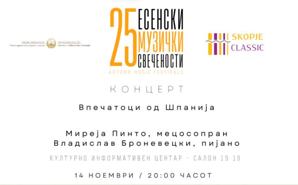 „Есенски музички свечености“: Концертот „Впечатоци од Шпанија“ се презакажува за 14 ноември поради здравствената состојба на еден од изведувачите