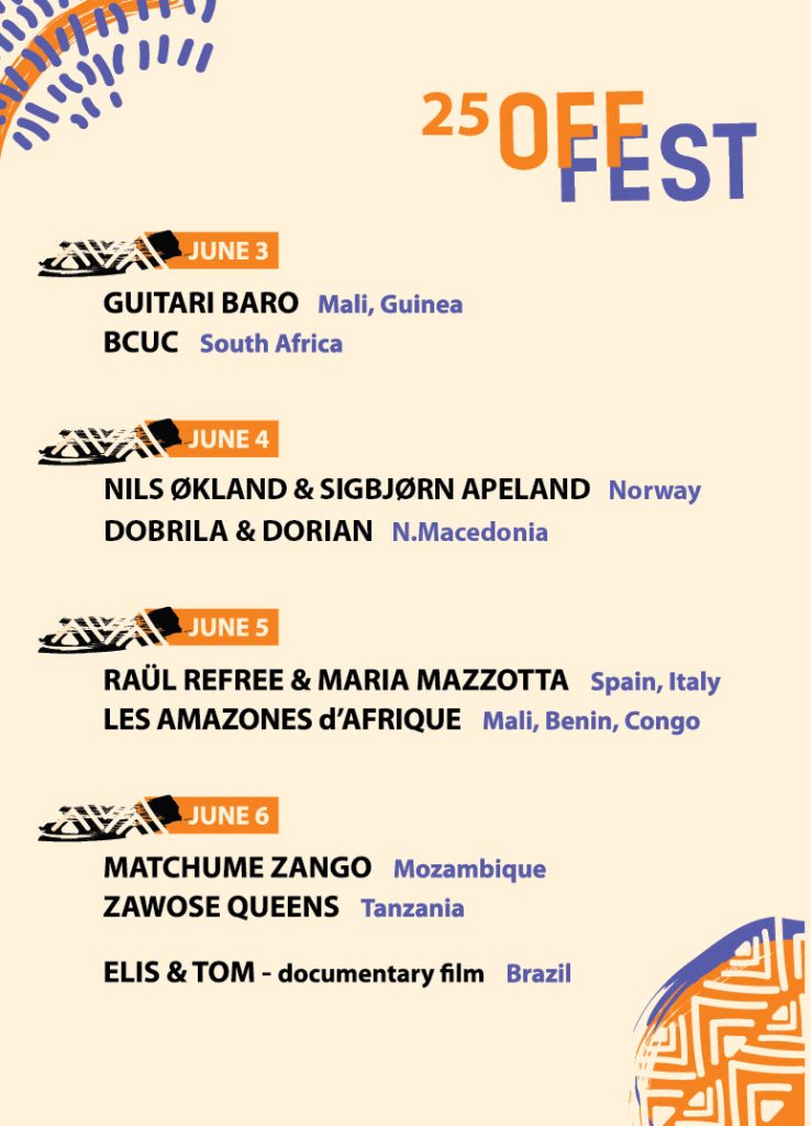 Организаторот на ОФФест најавува одличен избор, достоен за јубилејот и богатата историја на фестивалоткој ќе се одржи од 3-6 јуни: GUITARI BARO, BCUC, NILS ØKLAND & SIGBJØRN APELAND, DOBRILA & DORIAN, RAÜL REFREE & MARIA MAZZOTTA, LES AMAZONES d’AFRIQUE, MATCHUME ZANGO и ZAWOSE QUEENS. Со престижни учесници од вкупно 15 земји, во најголемиот број африкански. Следејќи ја убавата традиција, во прудружната програма на ОФФест ќе биде прикажан и култниот бразилски документарниот филм „ELIS & TOM“.
