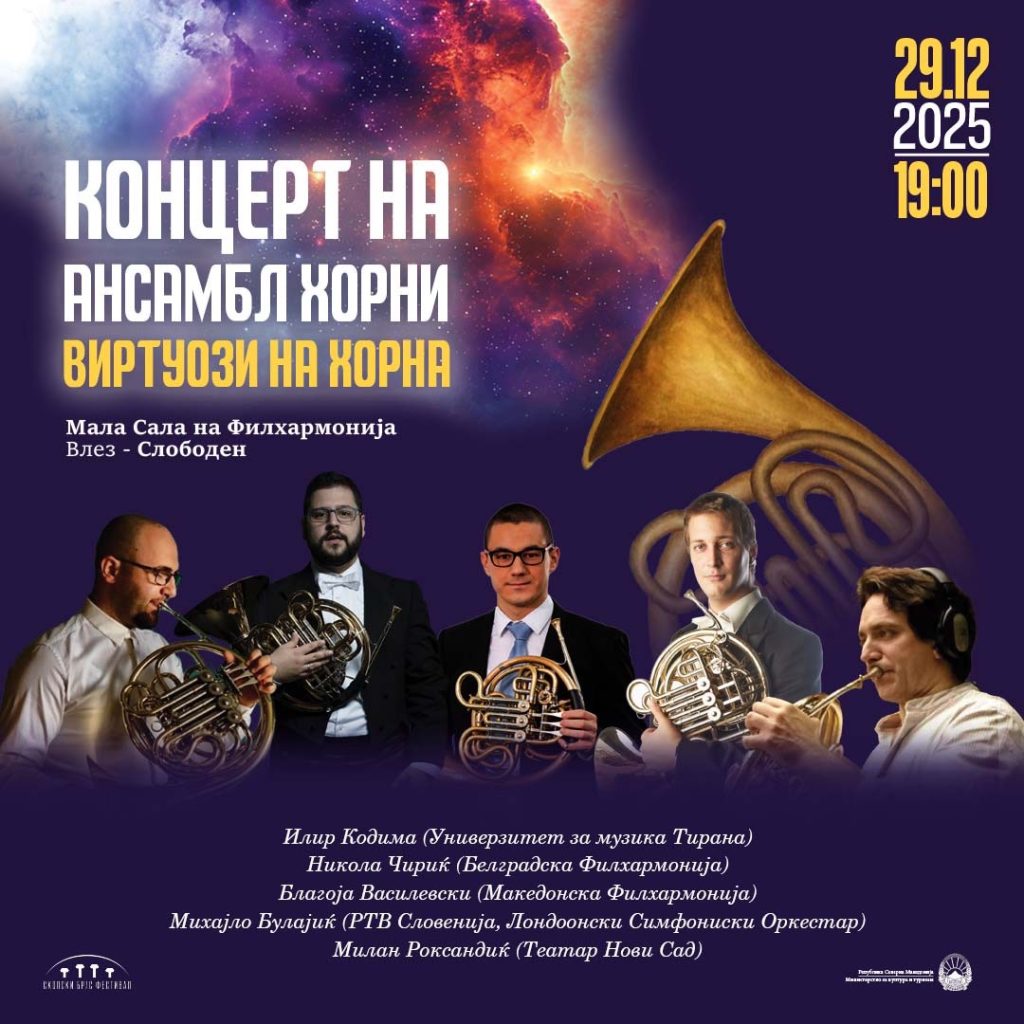 Во малата сала на Филхармонија на 29 декември (понеделник) во 19 часот ќе се одржи концерт на кој ќе настапат виртуози на хорна од регионот, заедно со нашиот домаќин Благоја Василевски. На сцената ќе има различни формации, од квартети, се до октети, а гостите ќе изведат концертна програма која ќе ја прикаже хорната во нејзиното блескаво светло како кралица на лимените инструменти.