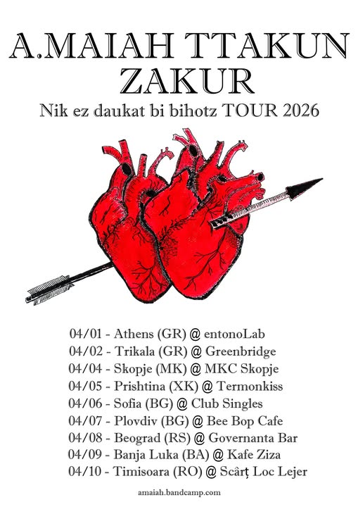 На 04 април во 20:00 часот во Џебно Кино – МКЦ, ќе одржат концерт Maiah Ttakun, како дел од нивната Балканска концертна промоција на неодамна излезениот албум “Ehortzi ezazue ene bihotza / Erre ezazue ene gorpua”.