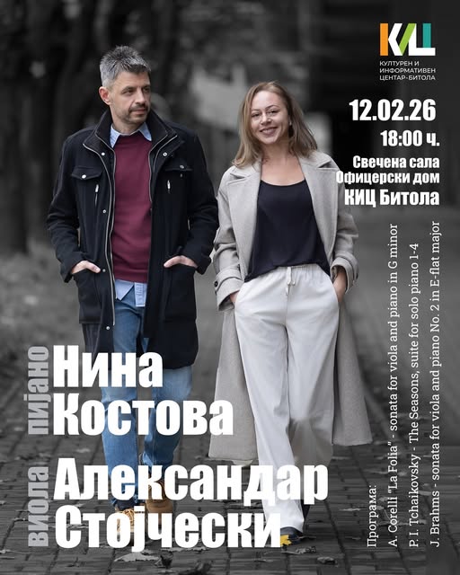 Само на еден ден пред самиот настан со возбуда го најавуваме музичкото патување со делата на Корели, Чајковски и Брамс, а во изведба на брилијантните Нина Костова на пијано и Александар Стојчески на виола, соопштија од КИЦ-Битола.