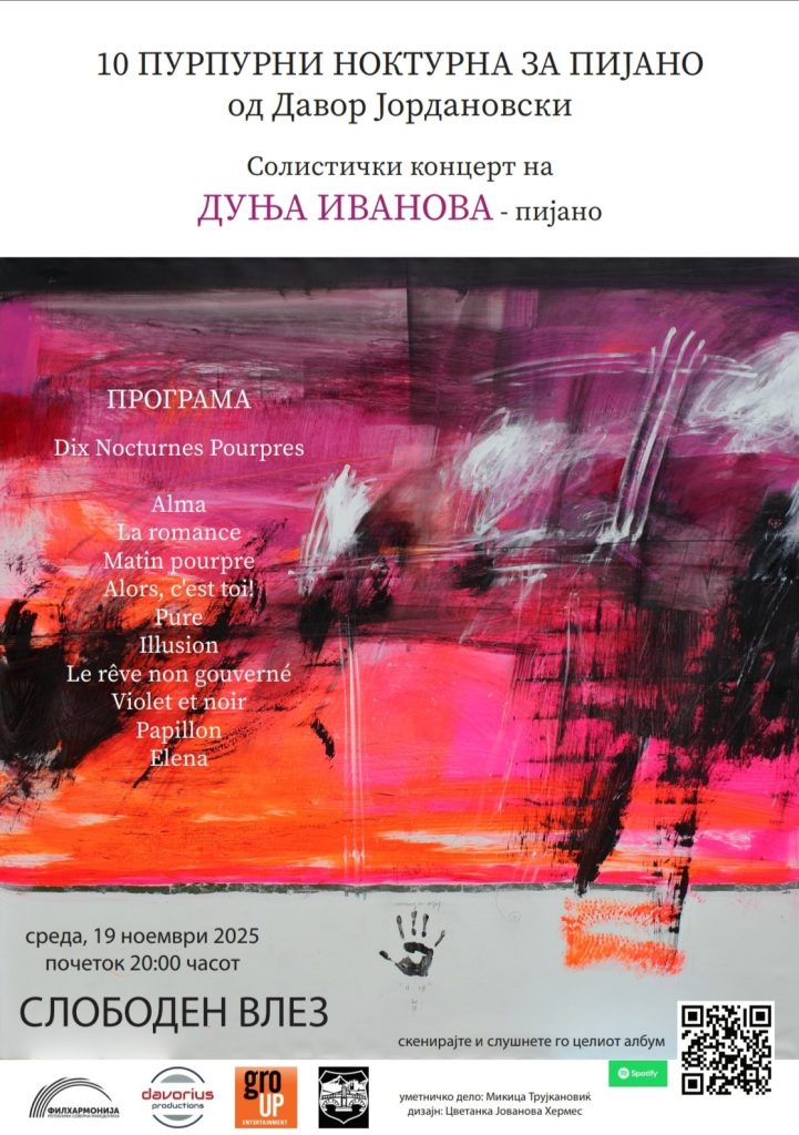 На 19 ноември (среда) со почеток во 20 часот, во Камерната сала на Филхармонија, ќе се одржи солистички концерт на пијанистката Дуња Иванова, на кој публиката ќе има можност ексклузивно да го слушне циклусот „10 Пурпурни Ноктурна за пијано“ од истакнатиот македонски композитор Давор Јордановски.