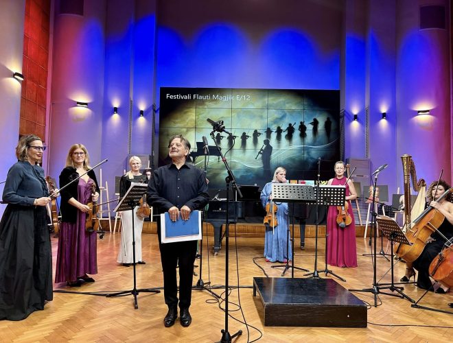 Триото го сочинуваат двете флејтистки Даниела Неделковска и Симона Марочковска Манојловска и пијанистката Светлана Димитриевска. Во вториот дел од концертот следуваше изведба на оркестарот на РТШ со кларинетистот Роланд Бербиу, под диригентство на Фатос Керимај.
