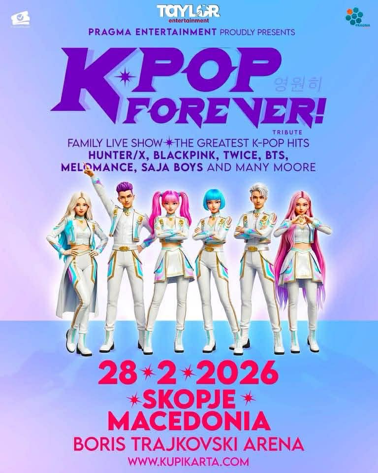 K-POP FOREVER! е визуелно и музичко патување низ најиконичните моменти на корејската сцена. Публиката ќе ужива во live интерпретации на хитовите што ги поставија BTS на врвот на светската поп-култура, моќната женска енергија инспирирана од BLACKPINK, експлозивните кореографии на TWICE, романтичните мелодии на MELOMANCE, како и заразната поп-експлозија на HUNTR/X и SAJA BOYS.