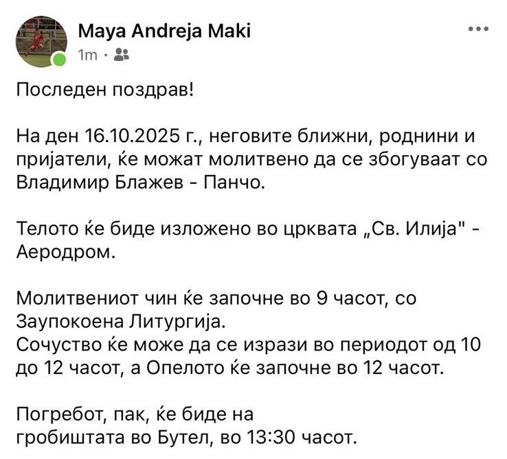 Панчо ќе биде погребан утре. На социјалните мрежи беше објавено дека телото ќе биде изложено во црквата Св Илија во Аеродром. Молитвениот чин ќе започне во 9 часот, роднините и пријателите ќе може да изразат сочуство од 10-12 часот, а опелото ќе почне во 12 часот.