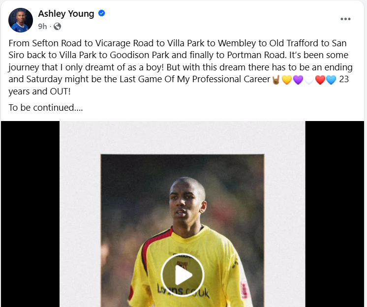 Поранешниот англиски репрезентативец и фудбалер на Ипсвич, Ешли Јанг, објави денеска крај на својата кариера.