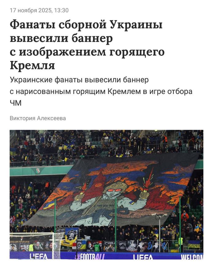 Украинските навивачи на мечот со Исланд вееја транспарент на кој е прикажан Кремљ како гори. Поточно на знамето имаше „пожар“ и навивач со бакља во раката.