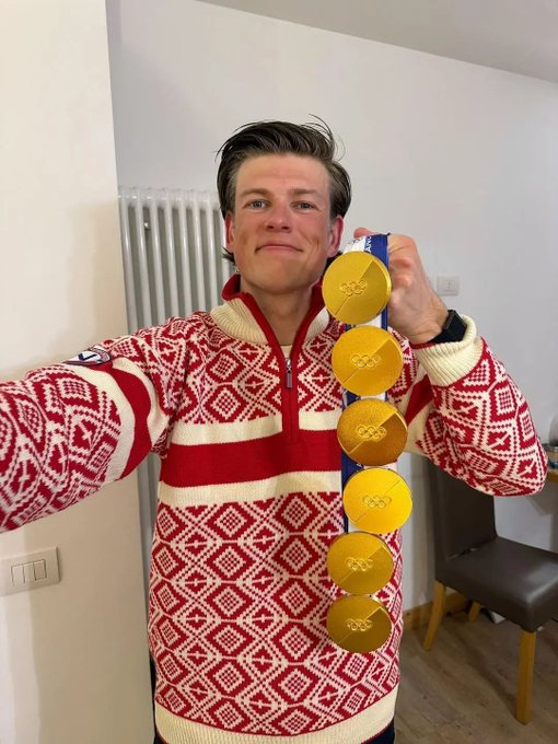 Клаебо буквално ги „покори“ сите дисциплини во крос-кантри скијање – од експлозивниот спринт, преку тешкиот скијатлон, па сè до маратонските 50 километри и тимската штафета. Неговото победничко селфи со шест златни одличја веќе стана најсподелуваната фотографија на социјалните мрежи, симбол на апсолутна доминација каква што светот досега нема видено.