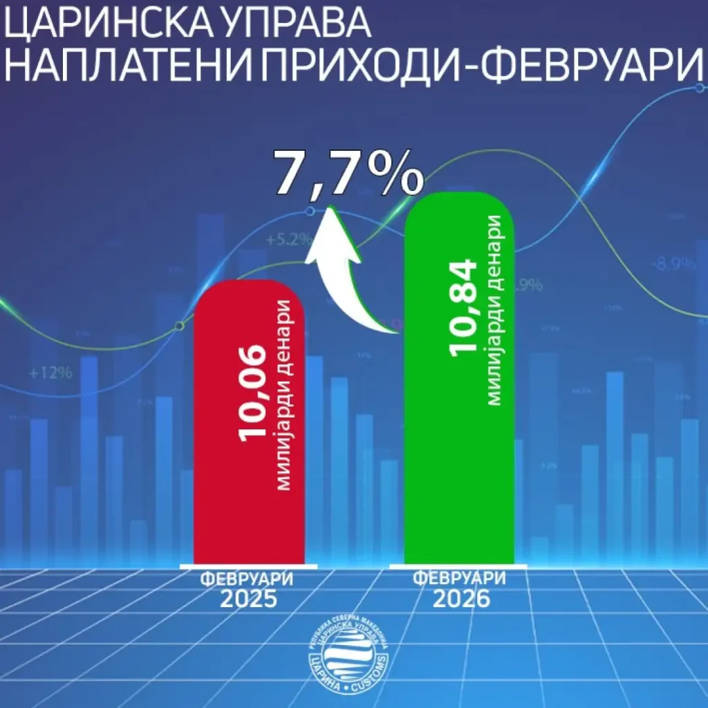 За 778,3 милиони денари или 7,7 отсто е зголемена наплатата на приходи во февруари, период во кој Царинската управа наплати вкупно 10,8 милијарди денари, соопштија од Царинската управа.