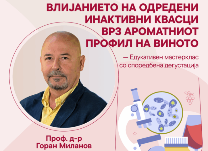 Професорот Миланов ќе ги запознае присутните на мастерклсот со одредени ензими и квасци коишто се користат во современото винарство и како тие влијаат на севкупниот ароматен профил на виното.