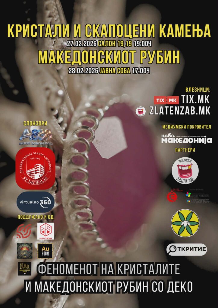 Jавно предавање од најголемиот промотор на македонскиот рубин, Деан Шкартов – Деко. Историјат, геологија, искуство, јувелирска вредност, енергија, мистика. Генерацијата која го постави новиот македонски стандард и го промовираше македонскиот рубин низ целиот свет. Македонскиот рубин низ изминатите години е подарен на рускиот патријарх Кирил, папата Бенедикт Шесанесетти, Папата Франциск, Дерил Хана, Жулиет Бинош, Изабел Ипер, императорот на Јапонија, Кралицата Елизабета Втора, емирот од Катар и многу други. Не ги пропуштајте двете предавања в петок и сабота во Скопје!
