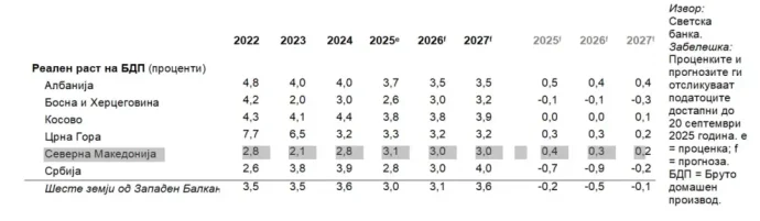 Реален раст на БДП од 3,1 отсто во 2025 година, од 3 проценти во 2026-та и од 3 отсто во 2027 година се проценките на Светска банка за земјава. Според последниот извештај, разликата во процентни поени од проекциите во пролетниот извештај за 2025 година е во нагорна линија и изнесува 0,4, 0,3 и 0,2 за овие три години.