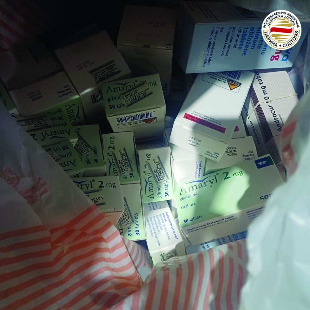 -На граничниот премин Св.Наум на влез во државата запленети се 75 пакетчиња и 123 ленти различни видови лекови (Amaryl 2 mg, Anafranil 25 mg, Procto Synalar-N 15 g, Androcur 50 mg, Pilokarpine, Arava 20 mg и други) за чиј увоз е потребна дозвола од Агенција за лекови и медицински средства. Лековите се пронајдени во една ќеса и една торба сместени под предните седишта на автомобил. Вредноста на привремено задржаните лекови изнесува 83.180 денари, додека вредноста на избегнатите давачки изнесува 8.526 денари.