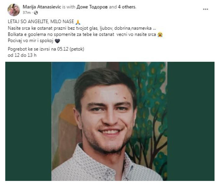 -Летај со ангелите мило наше. Нашите срца ќе останат празни без твојот глас, љубов, добрина, насмевка. болката е голема, но спомените за тебе ќе останат вечни во нашите срца. Почивај во мир и спокој, напиша сестрата на Миле.