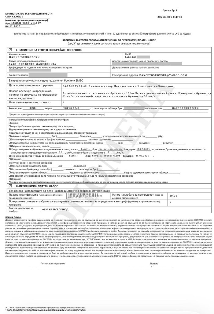 Министерот за внатрешни работи, Панче Тошковски, утрово добил смс-порака за сторен сообраќаен прекршок забележан од системот „Безбеден град“, додека со своето приватно возило се движел кон Кавадарци, каде денеска се одржува партискиот конгрес на ВМРО–ДПМНЕ. Како што објави, системот регистрирал движење со брзина што ја надминала дозволената за само 1 километар на час.