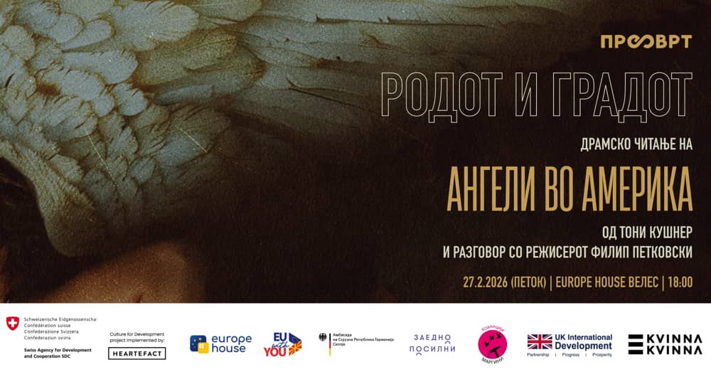 Драмско читање на култната драма „Ангели во Америка“ од Тони Кушнер, проследено со разговор со режисерот Филип Петковски, ќе се одржи вечерва во 18 часот во просториите на Јуроп хаус Велес. „Ангели во Америка“ е едно од најзначајните драмски дела на современиот театар – силна, емотивна и политички ангажирана приказна што ги отвора прашањата за идентитетот, љубовта, вербата, припаѓањето и стравот. Дејството е сместено во Америка во 1980-тите, во време на ХИВ кризата и длабоки општествени поделби, но темите што ги обработува драмата остануваат вознемирувачки актуелни и денес.