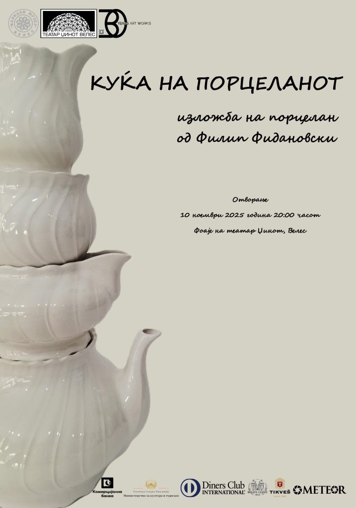 Само еден час подоцна, во 20 часот, во фоајето на Театар „Џинот“ ќе биде отворена втората изложба, „Куќата на порцеланот“ – скулптури и просторни инсталации на современиот уметник и керамичар Филип Фидановски.