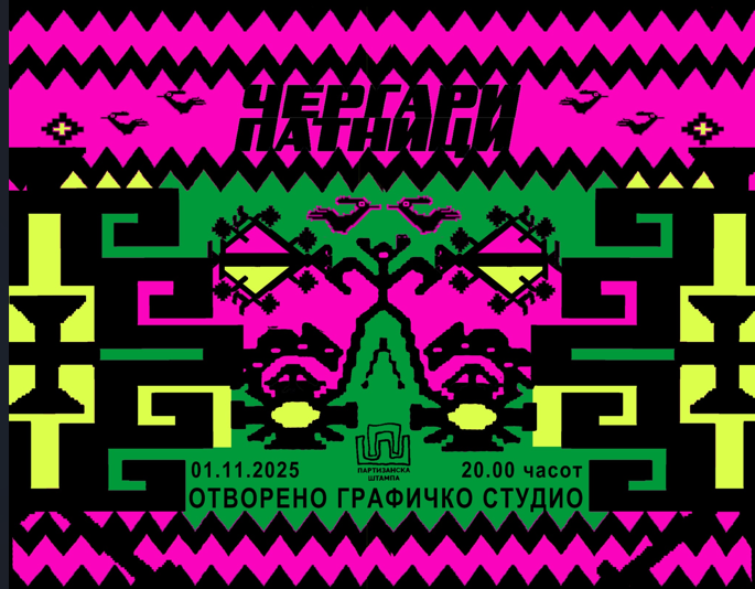 Во сабота 01 ноември со почеток во 20 часот во Галеријата на Отворено Графичко Студио, Партизанска штампа ја претставува изложбата „Чергари, патници“ – уметничко патување низ архетипите на колективната меморија, традиционалната македонска орнаментика и современата графика. Проектот опфаќа изложба на графики и книга во сито печат, создадени во изминатата година во студиото на Партизанска штампа.