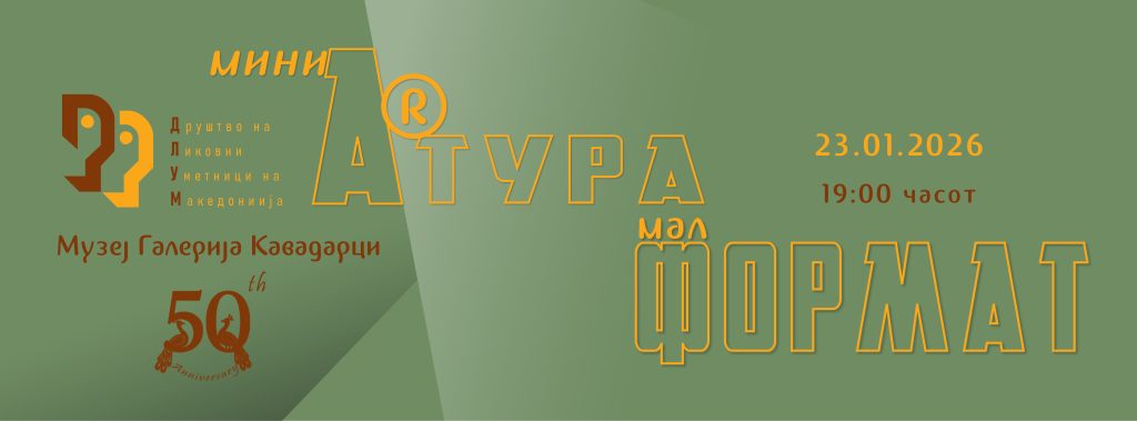 Изложбите „Мал формат“ и „МиниАРТура“ во Музеј галерија Кавадарци се отвораат на 23 јануари Култура 21.01.2026 Поради големиот интерес, изложбите „Мал формат“ и „МиниАРТура“ на Друштвото на ликовните уметници на Македонија ќе бидат отворени на 23ти јануари од 19 часот, во Музеј-галеријата – Кавадарци и поставките ќе бидат отворени за посета до 12 февруари.