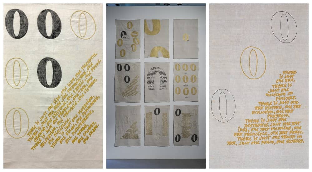 – Нивното дело се состои од шест рачно ткаени ленени панели со вез, графит и текстилна боја, кои претставуваат долгорочно истражување на односот меѓу текстот, визуелната структура и материјалноста. Рајнхардовиот текст функционира како конкретна поема со тон на итност, кој силно кореспондира со темите присутни во нивната практика: институционална критика, контекстуализација на уметничкото производство и личната политика. Неговите афирмативни, речиси мантрични изјави – како „Постои една ликовна уметност, еден музеј на ликовната уметност, еден уметнички систем“ – отвораат простор за критичко преиспитување на структурите што го обликуваат современиот уметнички и општествен контекст. Во комбинација со ритмичниот графички јазик на Бриџит Рајли, овие елементи создаваат континуум на концептуални и естетски вредности – објаснува Попова.