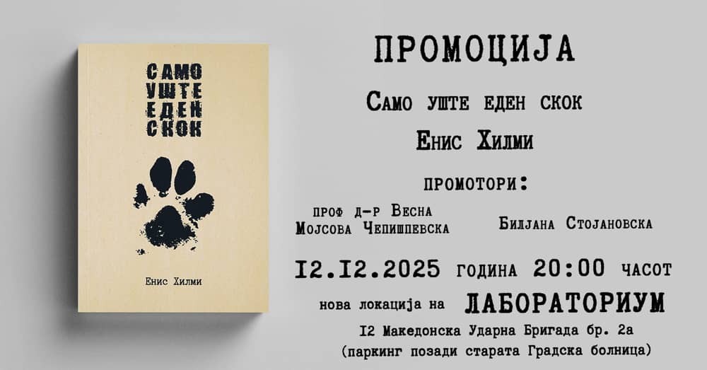 Книгата поезија „Само уште еден скок“ од Енис Хилми, ќе биде промовирана вечерва во 20 часот во „Лабораториум“ (нова локација, на паркинг зад старата Градска болница, 12. Македонска ударна бригада бр. 2а) во Скопје. Книгата ќе ја промовираат Весна Мојсова Чепишевска и Биљана Стојановска.