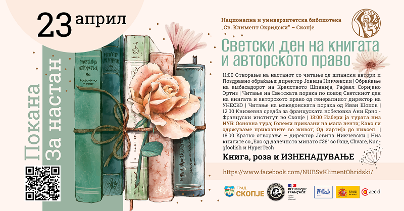 Националната и универзитетска библиотека „Св. Климент Охридски“ – Скопје, во соработка со Амбасадата на Кралството Шпанија во Македонија, Град Скопје и Францускиот институт во Скопје, годинава заеднички ќе го одбележат Светскиот ден на книгата и авторското право со интерактивна програма.