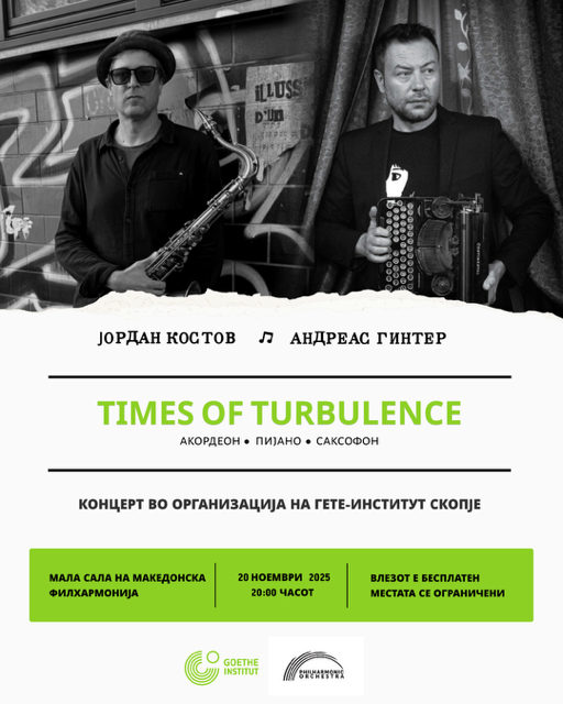 Концертот „Times of Turbulence“ ќе се одржи на 20 ноември од 20 часот во малата сала на Македонската филхармонија.