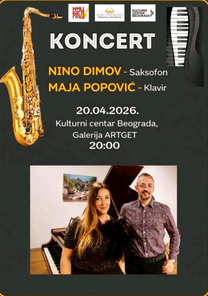 Вечерва, во 20 часот, во Културниот центар Београд, ќе се одржи концерт за пијано и саксофон, во изведба на Маја Поповиќ и Нинослав Димов. Македонскиот КИЦ во Белград, кој е организатор на овој музички настан, поддржан од Министерството за култура и туризам, продолжува да гради партнерски односи со познати културни инститиции, како што е една од најпознатите и најпопуларните, Културниот центар Београд, сместен на централната белградска улица, Кнез Михајлова бр. 5.