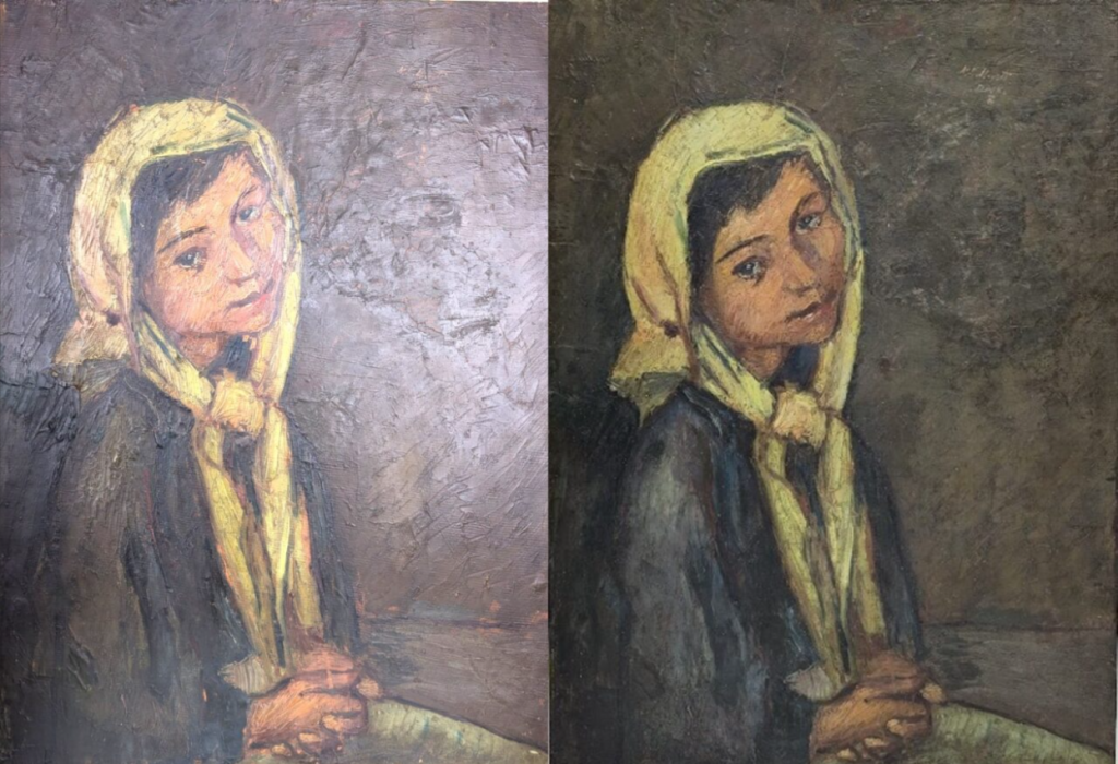 Сликата „Девојчиња“ беше затекната со стара интервенција и локални оштетувања, залепен акрилен лак за стаклото, подглобочувања и пожолтен заштитен слој. По тестирањата, делото беше селективно исчистено со pH 7 + Tween и органски растворувач, боениот слој стабилизиран со BEVA 371, загубите на боениот слој пополнети со конзерваторски кит, а ретушот изведен миметички. Рамката беше исчистена, дезинфицирана и визуелно интегрирана со акварел и корективна позлата.