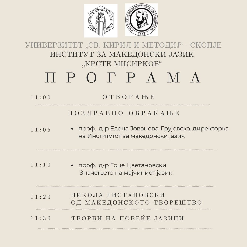 Пред присутните ќе се обрати директорката на Институтот, проф. д-р Елена Јованова-Грујовска. Пригодно обраќање на тема за значењето на мајчиниот јазик ќе има проф. д-р Гоце Цветановски, научен советник во Институтот.
