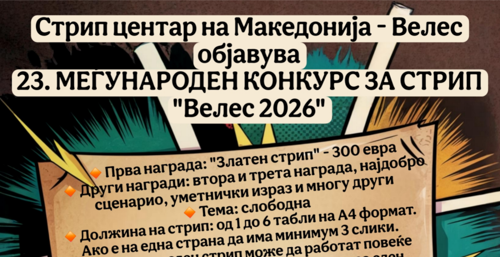 Во рамки на подготовките за 23. Меѓународен стрип салон „Велес 2026“, кој се смета за најзначајната стрип манифестација во Македонија, е распишан меѓународен конкурс за стрип на кој право на учество имаат автори од целиот свет. Конкурсот е дел од традиционалните активности на Салонот и се реализира со финансиска поддршка од Министерството за култура на Република Македонија и Општина Велес.