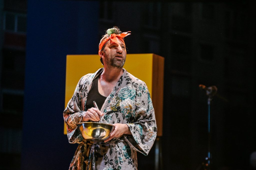 Актерот Сашко Коцев во претставата игра еден ист лик во неколку сцени.