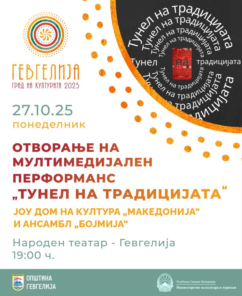 Во Народниот театар во Гевгелија вечер ќе се одржи мултимедијалниот перформанс „Тунел на традицијата“, во организација на ЈОУ Дом на култура „Македонија“ и Ансамблот „Бојмија“ од Гевгелија во рамки на програмата на манифестацијата „Гевгелија град на културата за 2025 година“, информираа од Општината.