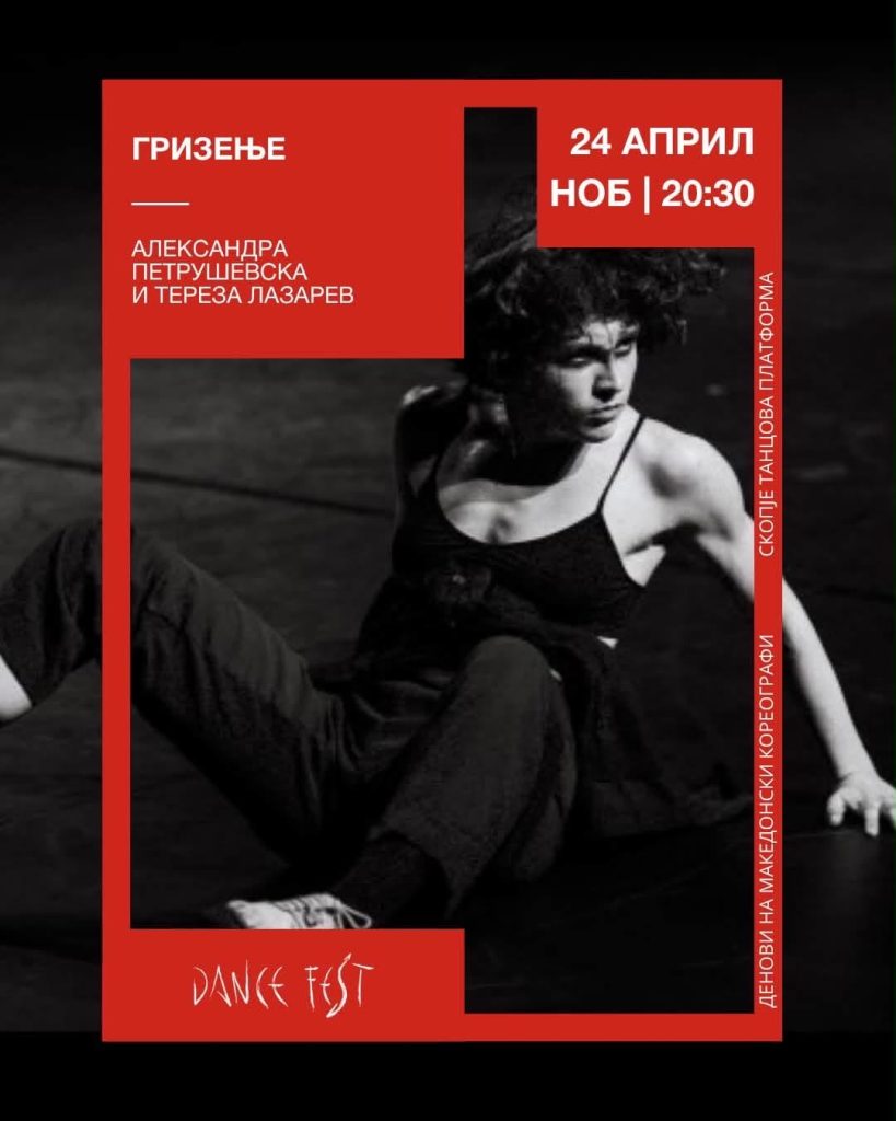 Програмата вечерва продолжува во Националната опера и балет во 20ч., претставата „Гризење“, кореографско дело на Александра Петрушевска, изведено од и создадено во соработка со Тереза Лазарев, на музика од Александар Гроздановски. Солото е резултат на нивната долгогодишна соработка и континуиран отпор кон доминантните форми во танцот и музиката. Телото влегува во прецизни, скулптурални позиции и веднаш ги распаѓа. Преку саморефлексија и самоподбив, танцот открива желба за постојано преиспитување на интенции, квалитети и позиции, но истовремено се обидува да ја сокрие кревкоста што произлегува од несигурноста во она што следи. „Гризење“ ја разоткрива поетиката на телото низ танц што не мирува, туку трепери, се двоуми и се гризе самиот себе. Музиката за претсавата е на Александар Гроздановски, а костимот, шминката и светло дизајнот го потпишува Александра Петрушевска.
