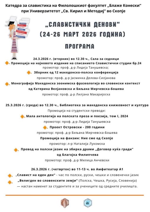 Од 24-26 март Славистички денови на Филолошкиот факултет „Блаже Конески“ Култура 24.03.2026 Од денеска на Филолошкиот факултет „Блаже Конески“ на УКИМ ќе се одржи манифестацијата „Славистички денови“. Предвидени се промоции на бројни изданија во Амфитеатарот А1.