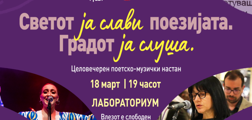 Под слоганот „Светот ја слави поезијата. Градот ја слуша“, ќе биде одбележан Светскиот ден на поезијата, со настан на кој ќе читаат 30-тина современи и афирмирани македонски поети и поетеси од сите генерации и со музичка програма од современи македонски музичари.