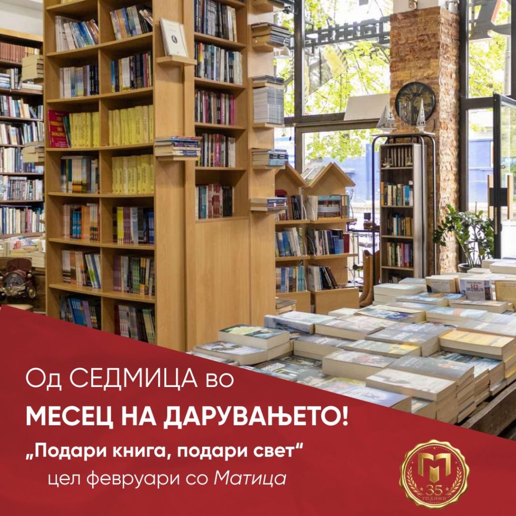 Од „Матица македонска“ искажуваат подготвеност, до крајот на февруари – Месецот на дарувањето книги во и од Македонија, книги да однесат секаде и заеднички со сите јавни личности, институции и општествено одговорни компании што ќе се обратат со желба и подготвеност за приклучување кон иницијативата „Подари книга, подари свет“ и да донираат книги онаму каде што се најпотребни.